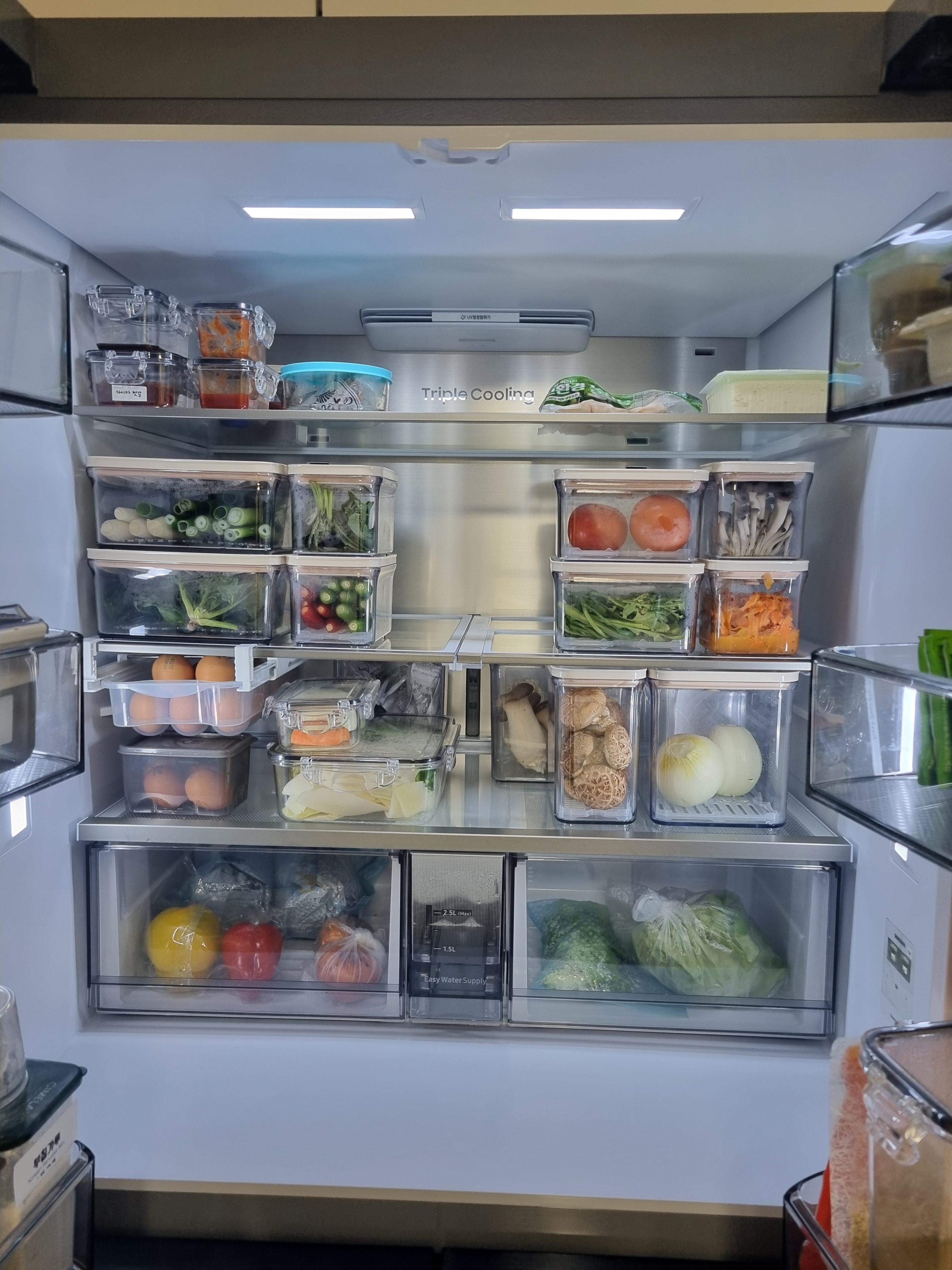 또 하나의 꿀팁은! 반찬용기를 전부 투명 용기로 통일한 거예요. 냉장고를 열었을 때 어떤 재료가 남았는지 바로 보이니까,